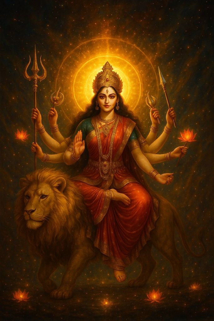 La Diosa Durga es uno de los aspectos más poderosos de la Diosa Madre Shakti, el poder supremo que se manifiesta en nueve formas divinas para otorgar fuerza, estabilidad, protección contra los obstáculos y la negatividad.